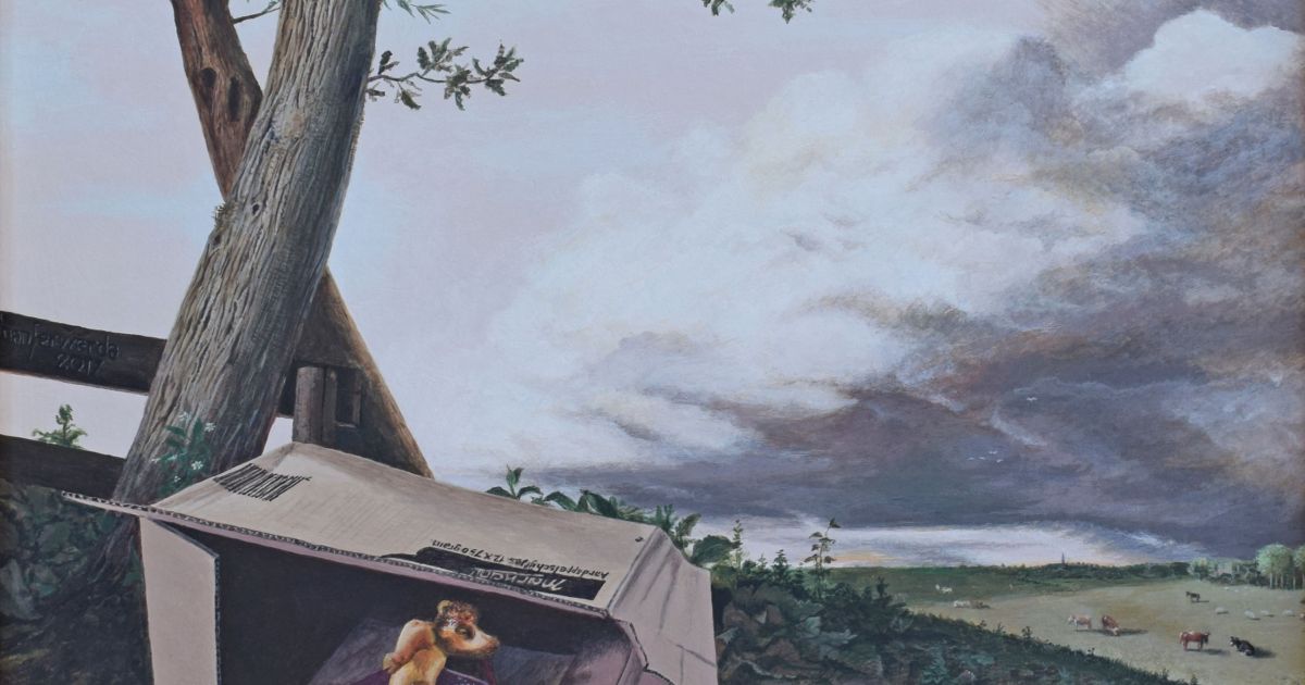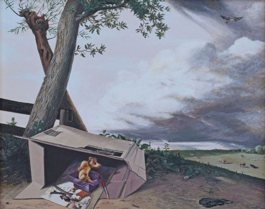 Het tweede gebruik van de doos spreekt Ferwerda ook enorm aan. Dat zie je dan ook vooral terug in zijn schilderijen. “De mens is een verzamelaar en bewaart mooie dingen en spullen vaak in een oude doos op zolder, in de schuur of de garage. Bij het later weer openen van zo’n doos komen vaak weer vele herinneringen naar boven. Ik zie de doos dan ook als een metafoor voor ons hoofd, ons brein”, legt hij uit. “Ons denken bouwt zich op uit ervaringen en beelden die we gezien hebben en daarna onthouden en opslaan. Zoals in de doos waarin we spullen en dingen in bewaren.”