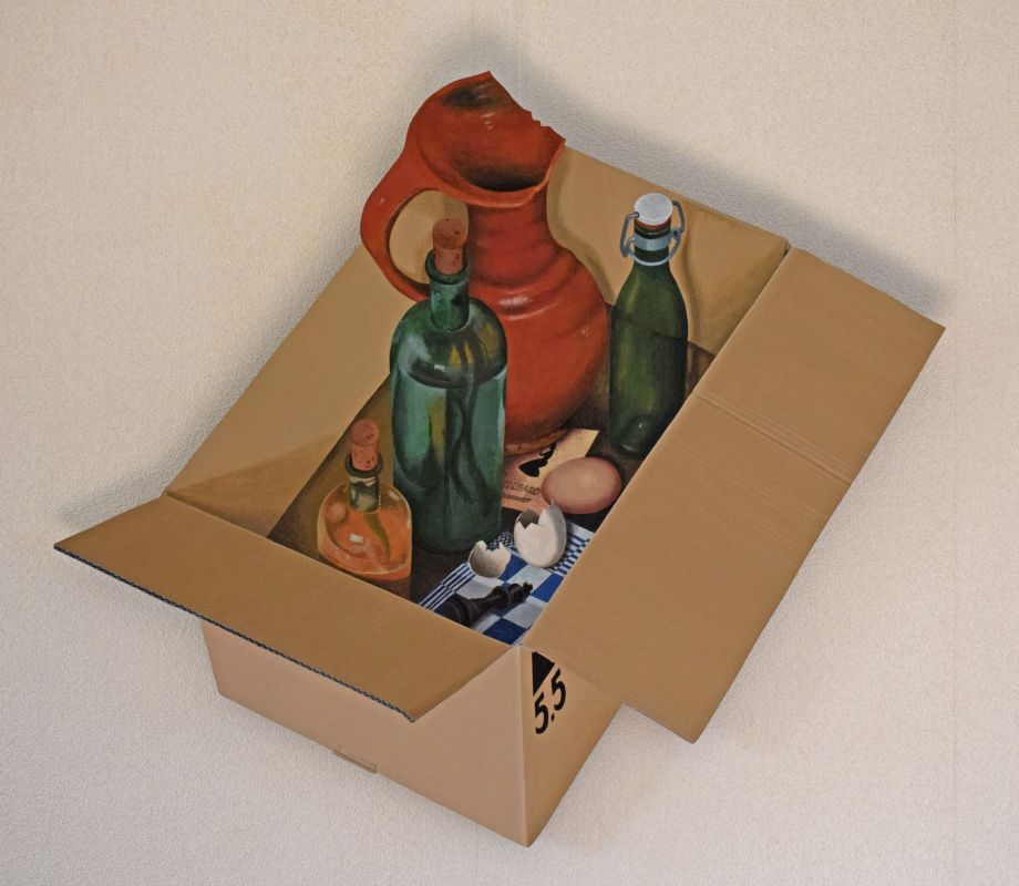 Naast zijn drukke werkzaamheden in het onderwijs begon Han Ferwerda zo’n 50 jaar geleden een zoektocht naar ‘iets om te schilderen’. Realistisch, ruimtelijk, 2-D, abstract, het kwam allemaal voorbij. In 1985 volgde een belangrijke ontwikkeling, toen Ferwerda besloot met het thema ‘doos’ te gaan werken. Een ordinaire kartonnen doos werd voor hem een grote bron van inspiratie. “Het teken-technische aspect van de doos boeit mij enorm”, vertelt de jubilerende exposant. “Een paar lijnen of enkele vlakken zijn al genoeg om de ruimtelijkheid van een doos te laten ontstaan. Daarnaast zie ik de doos als een verschijnsel van de consumptiemaatschappij. Alles wordt verpakt in kartonnen dozen, van koelkast en tv tot chips en koek.”